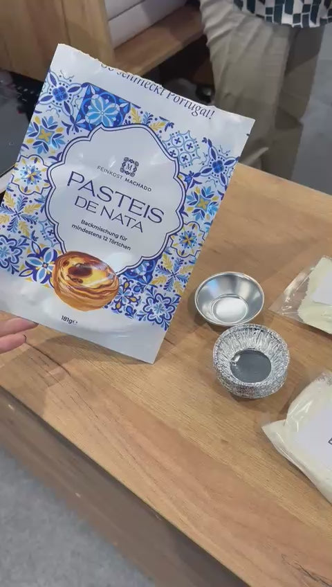 Mit der Pastéis de Nata Backmischung von Feinkost Machado zauberst du im Handumdrehen 12 original portugiesische Pastéis de Nata – außen knusprig, innen cremig und goldgelb gebacken wie in den berühmten Pastelarias Portugals.